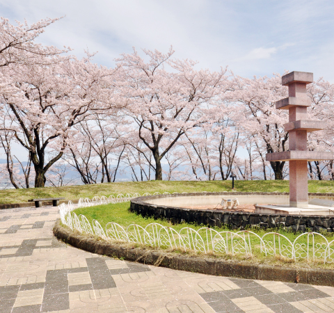 夫婦桜としても有名な甲州蚕影桜(コウシュウコカゲザクラ)をはじめ、ソメイヨシノ、ヤマザクラ等が300本植えられ、満開を迎える頃は森のようになり、見事に咲き乱れるピンク色の木々がなんとも美しい。広大な芝生広場や遊具も充実しており、週末は20店舗以上の売店やキッチンカーの出店もあるので、手ぶらで楽しめる。ライトアップと共に見る夜景も格別。