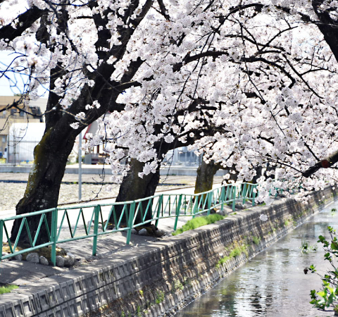 石和温泉の温泉街用水沿いを約900mにわたり満開の桜が彩る。まるで江戸時代にタイムスリップしたかのような、風情のある街並みに思わず息を飲むほど。ライトアップされて夜桜も楽しめるので、思い切って着物で出かけてみるもの乙な楽しみ方。咲き誇る桜と水のせせらぎに癒されること間違いなし。