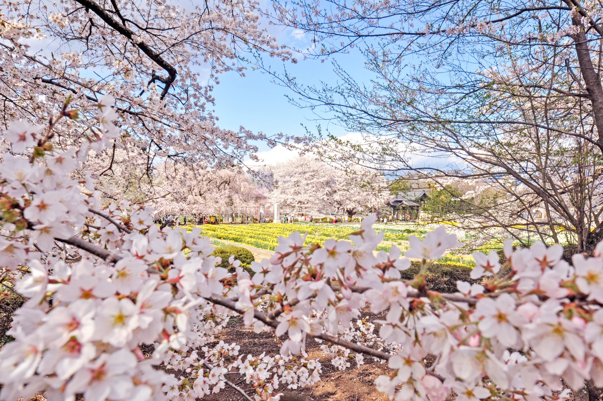 同じ時期には約8万本のラッパ水仙が咲き、桜の薄紅色と水仙の黄色のコントラストは絶景。
