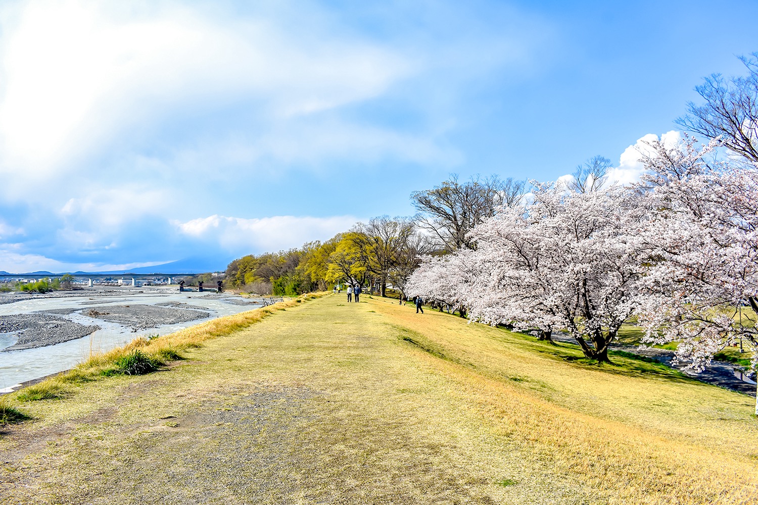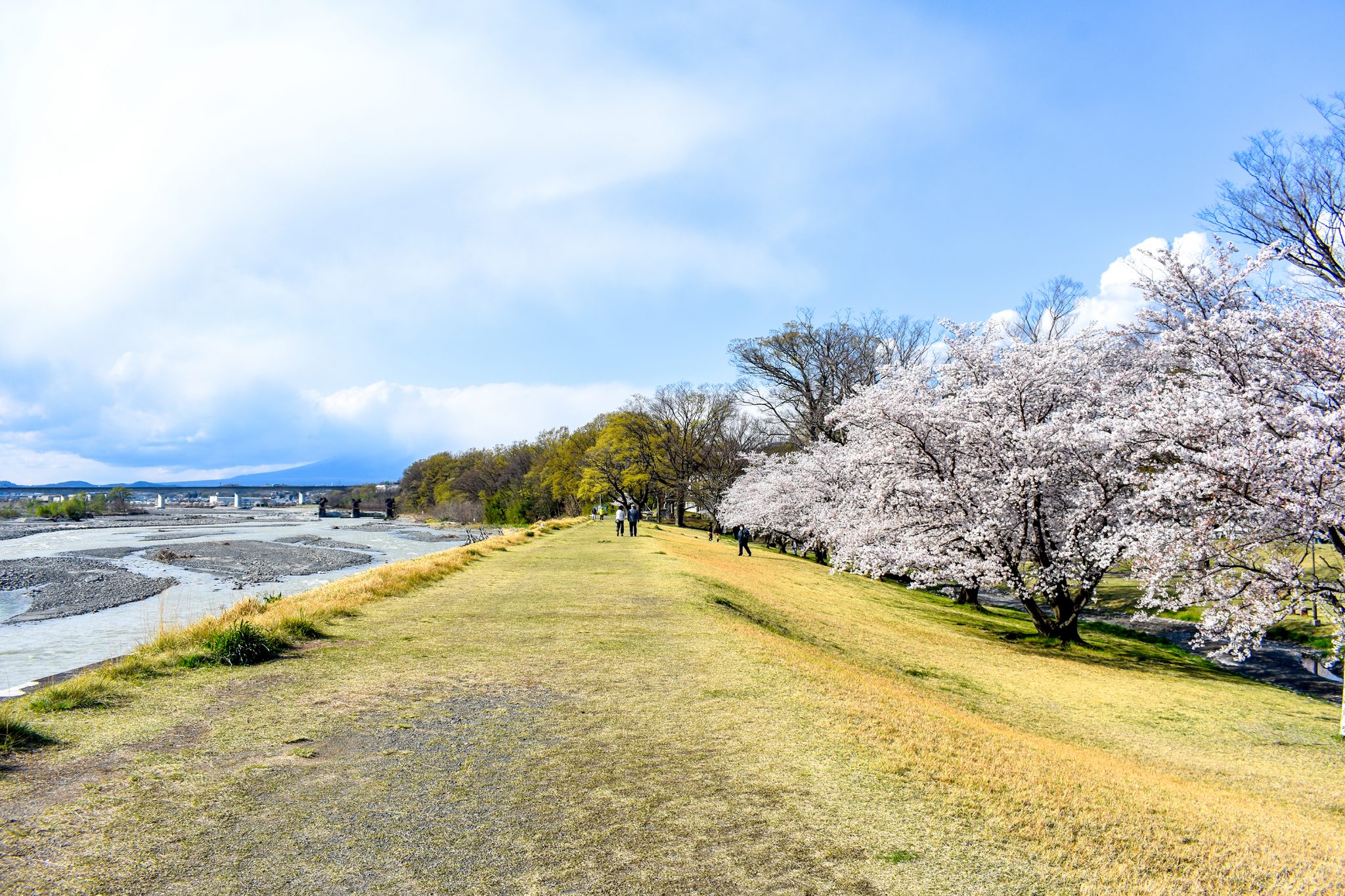 甲斐市にある信玄堤公園は、武田信玄が戦国時代に築いたとされる堤防の跡地に作られた釜無川沿いの公園。