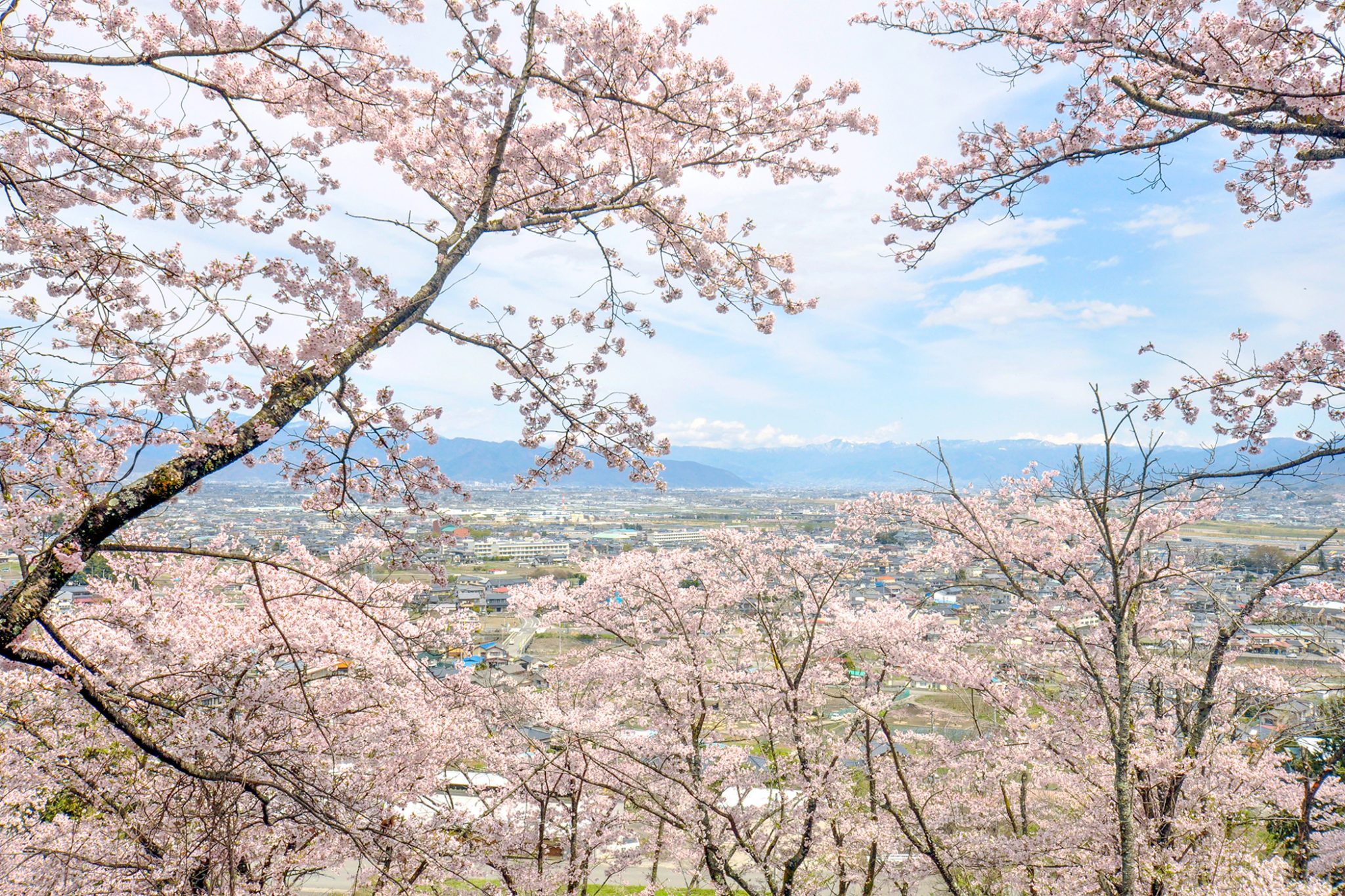 甲府盆地を一望しながら、満開の桜に思わず童心に返れる。