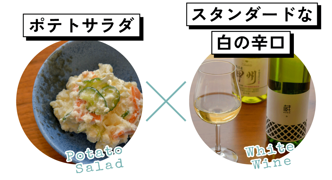 さっぱりとしたポテトサラダには、やはりさっぱりとした飲み口のスタンダードな白の辛口がピッタリ。マヨネーズが多めのポテサラなら甘口の白も◎。