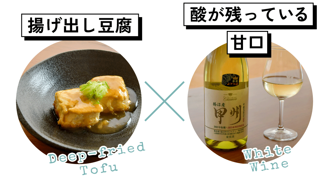 揚げ出し豆腐の自然な甘みをもっと引き出してくれるのは、甘口だけどそこまで甘さが強くないもの。酸がしっかり残っている甘口が好相性。