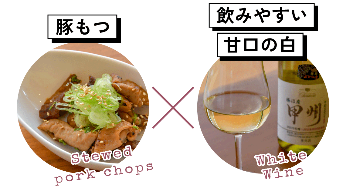 フルーティな甘口の白ワインは、口の中でもつの臭みを消し、旨味に変えてくれる働きあり。それぞれの持つ個性で素晴らしいペアリングが実現。