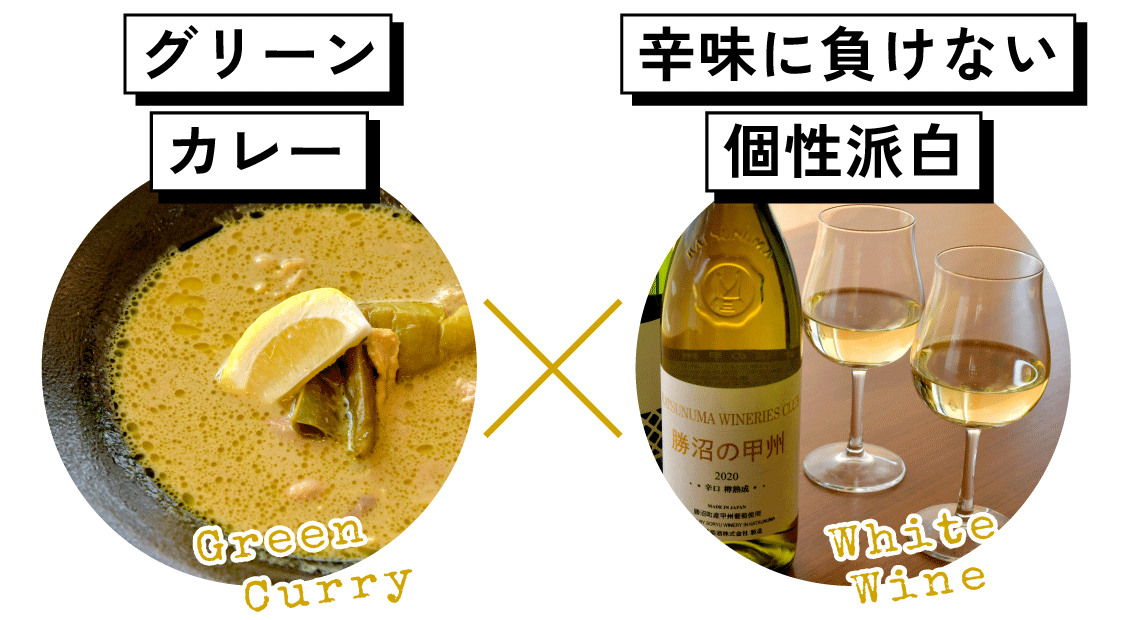 唐辛子の辛みが強いグリーンカレーはレモンを加え、ワインで流し込むイメージ。後味にふわっと柑橘系の香りが残り、なかなかの相性。