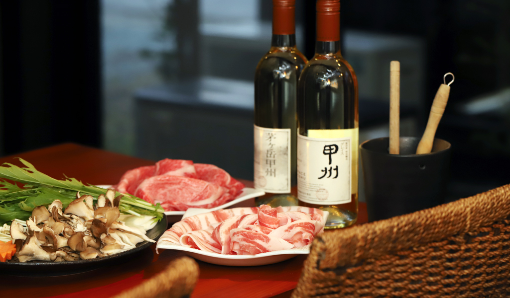 さっぱりとしたシンプルなしゃぶしゃぶには、まろやかな果実味と酸味がバランスよく調和する甲州ワインが見事にマッチする。柑橘系のアロマと引き締まった酸味が魅力の「茅ヶ岳甲州」「グレイス甲州」。赤の中でも清涼感があり、果実の芳醇な香りとピュアな味わいの「YAMANASHI de GRACE」「ルージュ クサカベンヌ」。個性溢れるワインを自由な発想で合わせてみよう。
