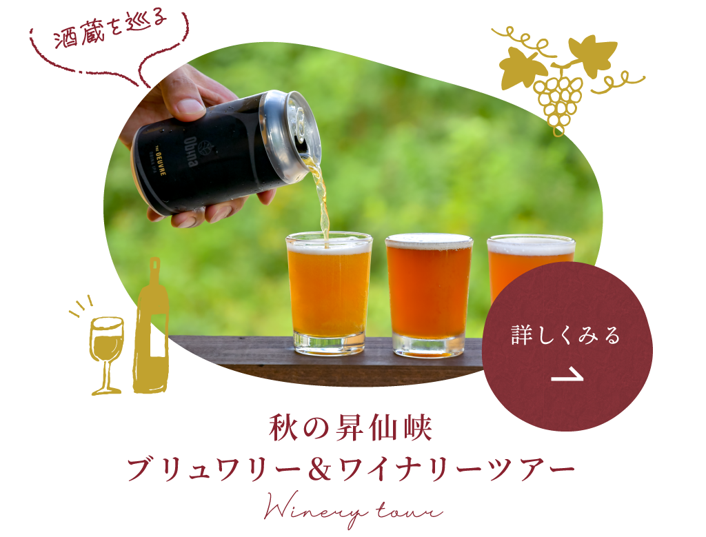 出発地/甲府駅南口→Obina Brewing(見学・試飲・ランチ)→昇仙峡(自由行動)→ドメーヌQ(見学・買い物・試飲)→到着地/甲府駅南口(約7時間)掲載施設