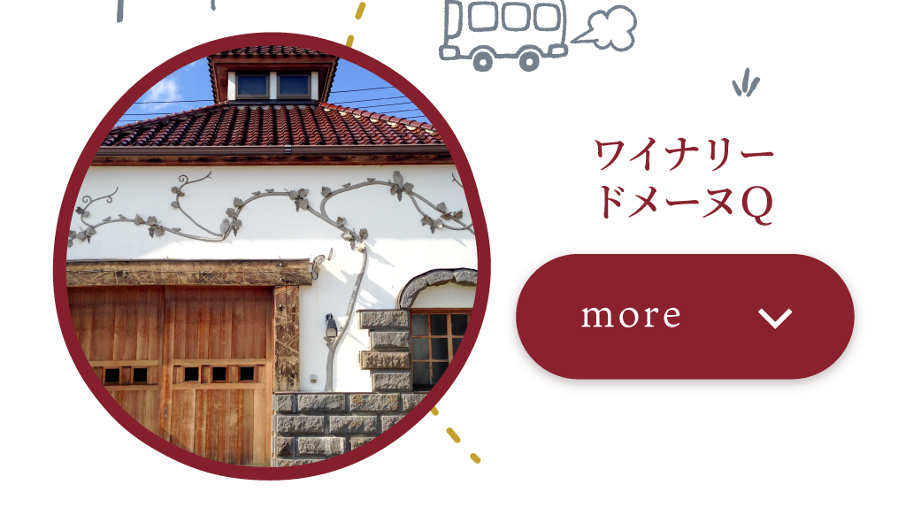 甲府市桜井町にある小規模ワイナリードメーヌQ。日本では栽培が難しいとされるピノ・ノワールを自社畑で栽培、醸造し、水はけの良い土壌を生かしたエレガントで高品質なワインを多数生み出している。敷地内には、ワインカーブのほか直営レストラン「ボルドー」やチャペル、ワインショップが点在しここでしか買えない限定ワインも購入できる。