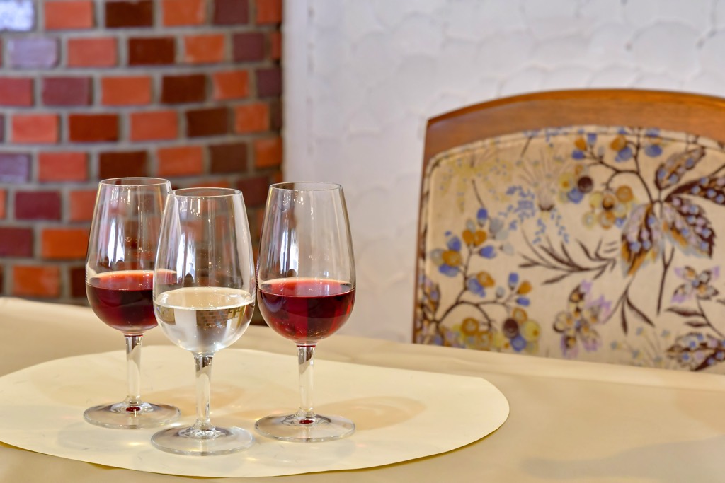 レストラン「ボルドー」では、3種類のワインをテイスティング(左から、ピノ・ノワール、ヌーヌーボー、ルージュQ)。毎年7月31日にはリリースするというどこよりも早い新酒で知られる「ヌーヌーボー」は、早摘みの青デラウェアを原料にリンゴ酸を多く含んだキリッとした切れ味が特徴。収穫したばかりのフレッシュな味わいをご堪能あれ。