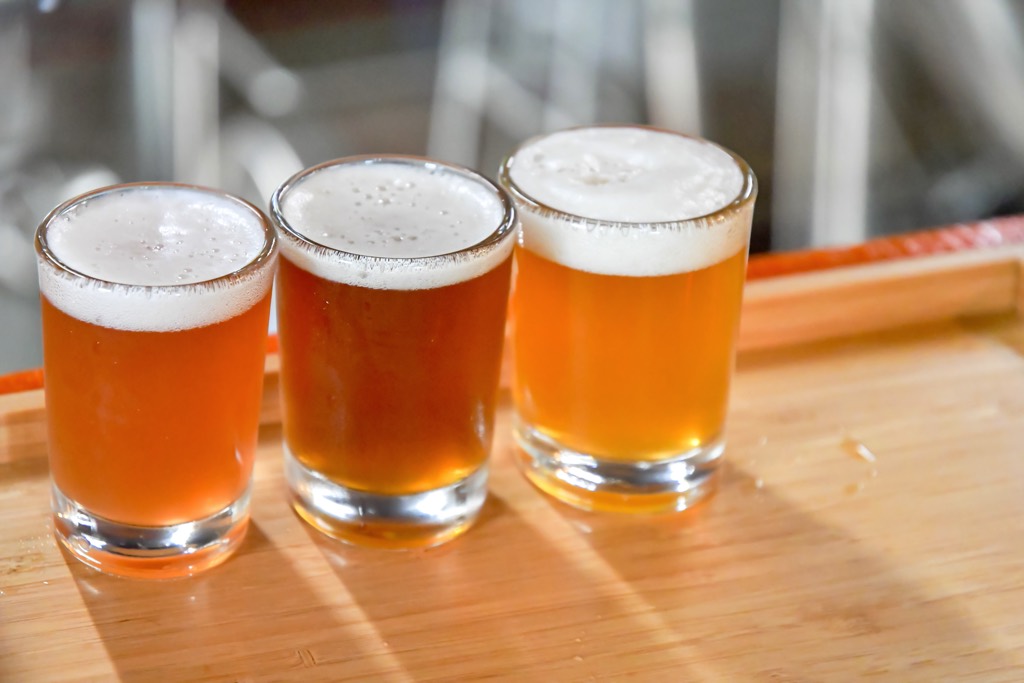 2階にあるアメリカンカフェでは、出来たてのクラフトビールが3種類飲み比べできる。「名水の地」としても名高い昇仙峡の上質な沸き水を仕込み水にしたビールは、帯那ブルーベリーを使用するなど地域を生かした個性溢れる味わいだ。超フレッシュな自家製帯那ホップのフルーティーな香りと奥行きのある苦みに虜になるはず!(左から、ブルーベリーセゾン・スチームエール・IPA)