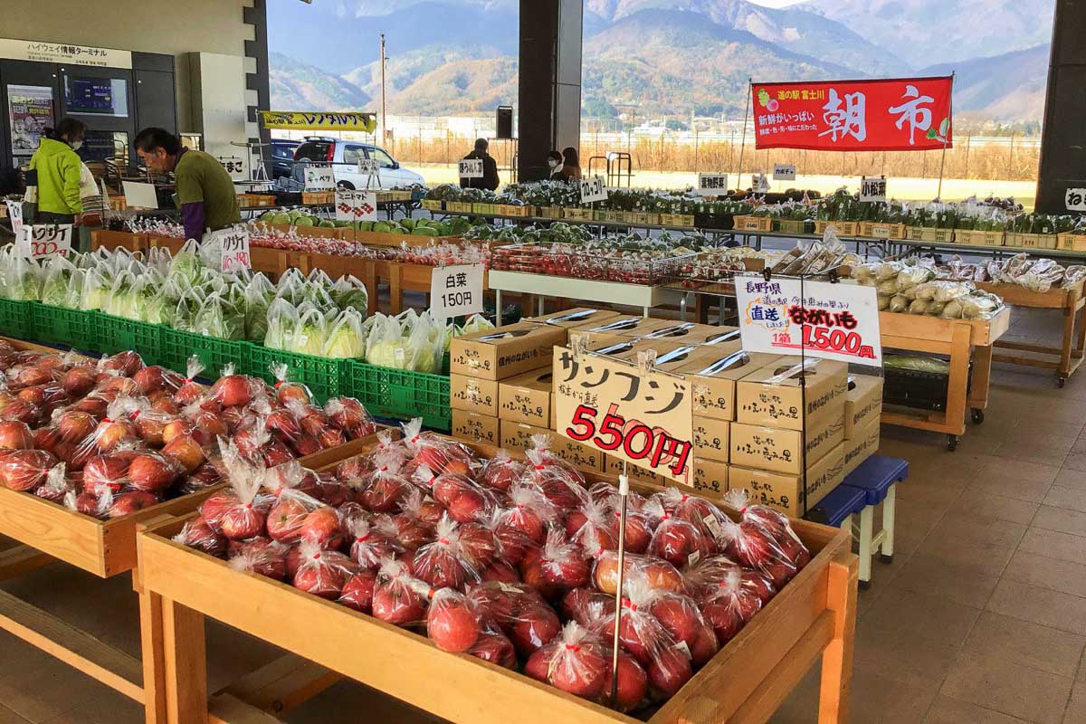 山梨県で第一号に登録された道の駅で、春にはタケノコ、夏にはスイカ、秋はしょうが、冬は菊芋やチョロギと、いつでも旬な野菜や特産品が並ぶ。