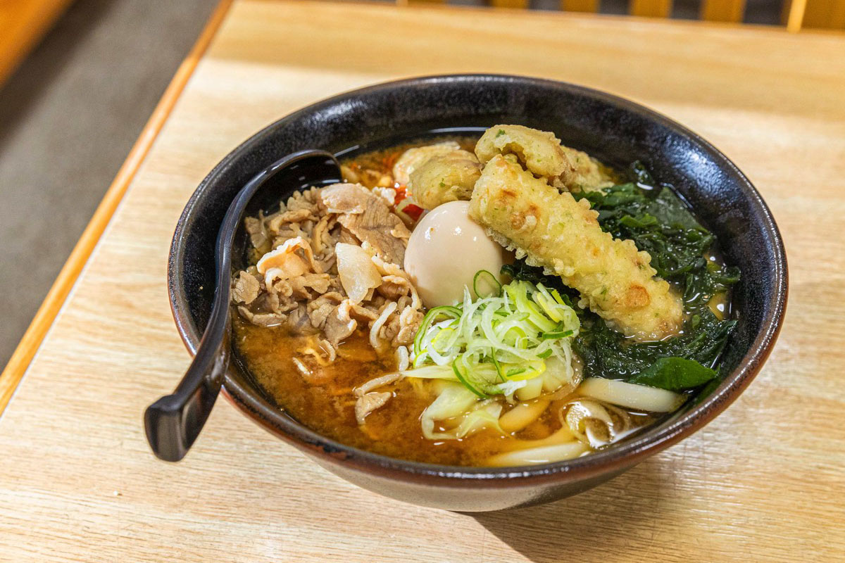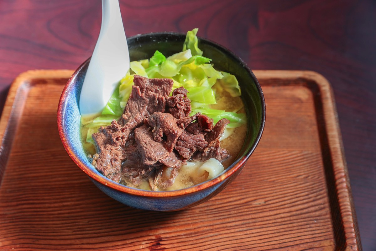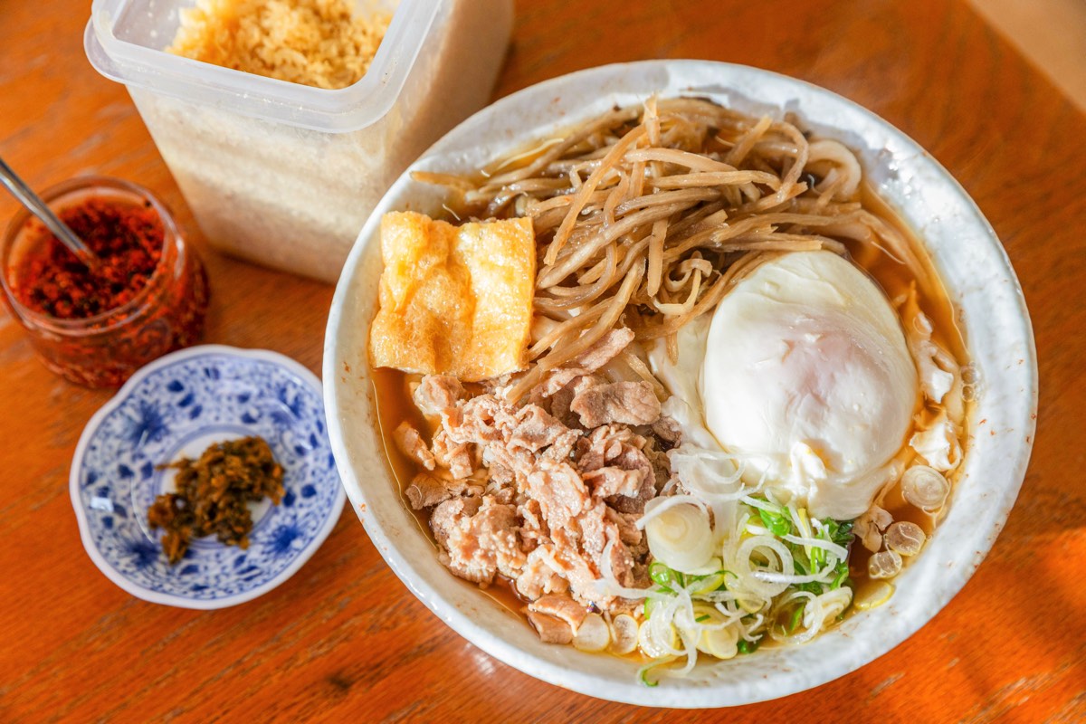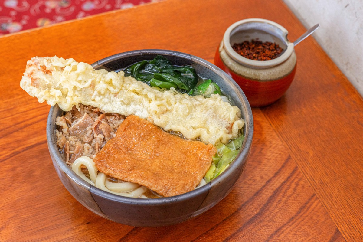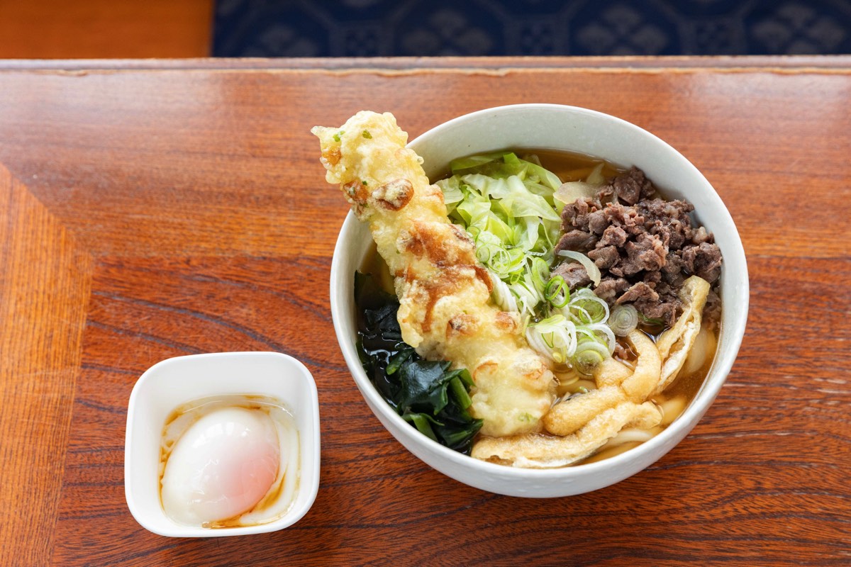 古くから馬肉食文化が定着している富士吉田市では、スーパーでも馬肉が安く入手可能。そこでうどんのトッピングとしては珍しい馬肉が使用された。甘辛く煮つけた馬肉はやわらかく、旨味も抜群!最近は豚肉や牛肉で代用するお店も増えている。