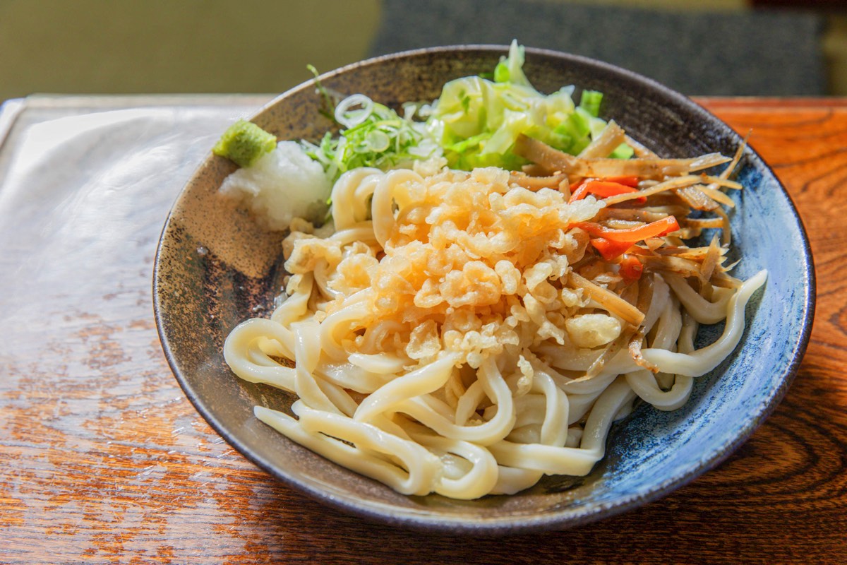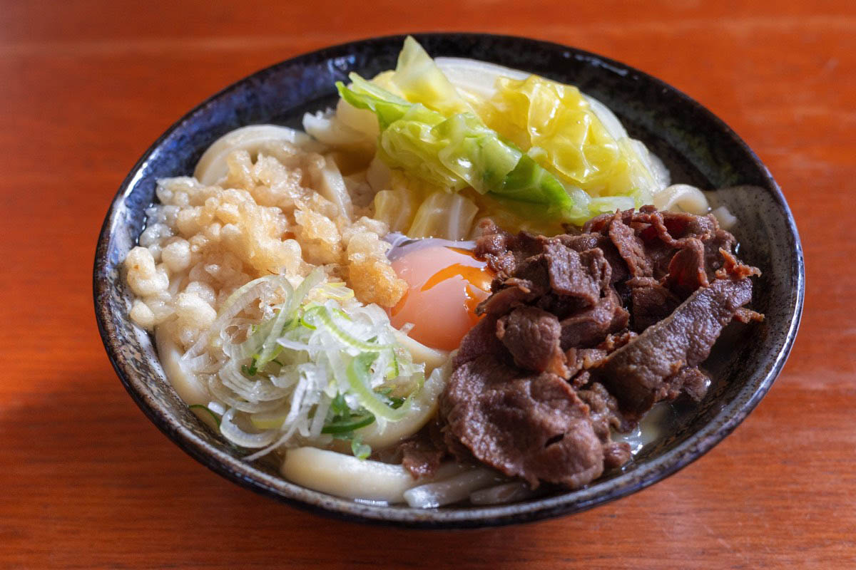 吉田のうどんに絶対外せないのが、この茹でキャベツ。土地柄、安定的に手に入る野菜ということでキャベツを使用していたが、消化を助けるだけでなく、シャキシャキとした食感がコシの強い麺とも相性がよく、美味しさを後押し。