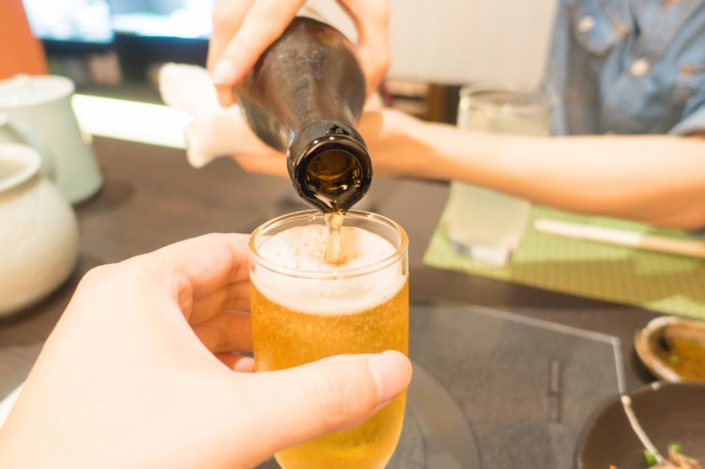 まずビールなどのビン類のお酒は、ラベルを上にして利き手で下から支えるように持ち、逆の手をビンの底にあてて注ぎます。